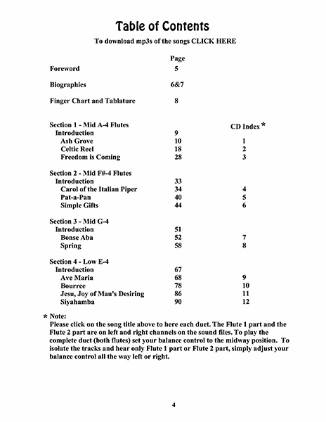 Please click on the song title above to here each duet. The Flute 1 part and the Flute 2 part are on left and right channels on the sound files. To play the complete duet (both flutes) set your balance control to the midway position. To isolate the tracks and hear only Flute 1 part or Flute 2 part, simply adjust your balance control all the way left or right.