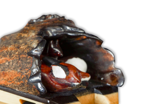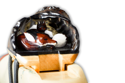 A litter of Fox kits sleeps with Mother in the warmth of a hollowed out log. White and blue with a touch of yellow and green are the colors of the Out-Of-Log.