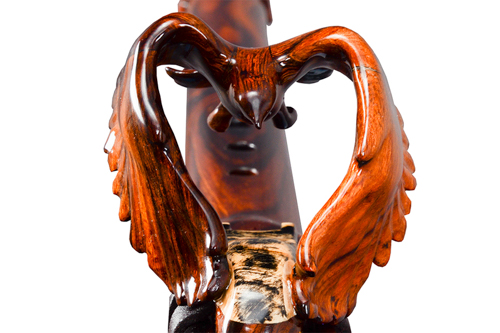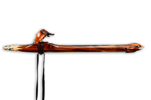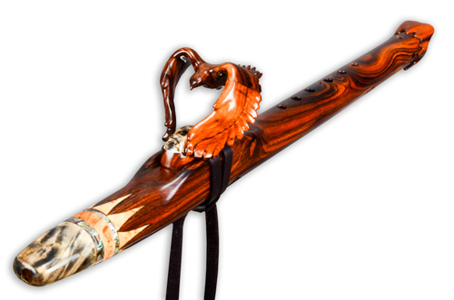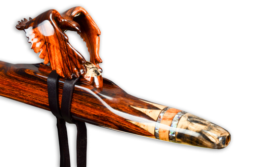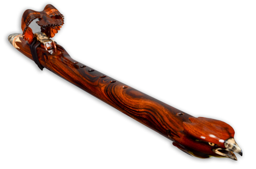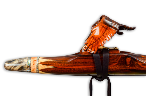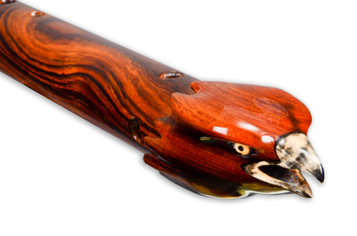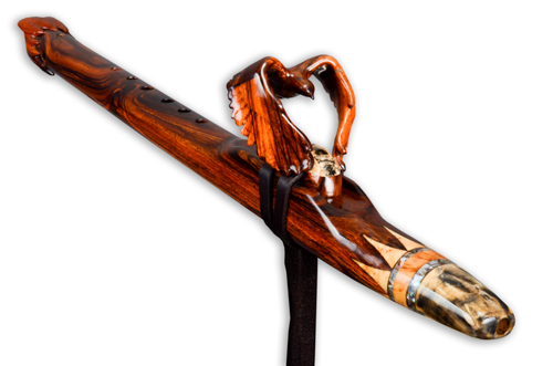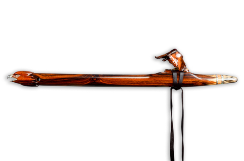 Soaring is made from Desert Ironwood with Box Elder Burl, Yellow Cedar Burl, and Abalone as trim. The mouth piece of Box Elder Burl is followed by an Abalone Inlay ring. the Abalone represents air or space. The Yellow Cedar Burl inlay represents the Sun.