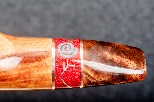 The mouthpiece, end cap, and totem top are all made from Tasmanian Blackwood. Tasmanian Blackwood was chosen for its rich color and contrast.