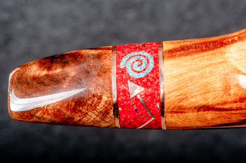 Within the thick, red coral band encircling the upper section of the flute is bound on either side by copper inlay. In the coral band you will find a beautiful Helix (or spiral) symbol inlaid with crushed sleeping beauty turquoise, as well as two thin bands of copper and a Broken Arrow with a shaft of shining silver and fletching and arrow head of copper. Towards the base of the flute, two thinner bands of red coral are separated by a thick band of turquoise.