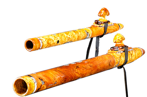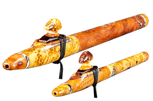 The copper inlay in the nest area of the flute is optional for new flute orders. This inlay adds $300 to the price of the flute. Other options for new build orders include a choice of which wood is used for the head joint of the flute and which for the tube. The High D that you see in the videos and pictures has a head joint of Western Red Cedar Burl and a tube of Yellow Cedar Burl. The Low D is the opposite with the head joint of Yellow Cedar Burl and tube of Western Red Cedar. There is no price difference for this selection.