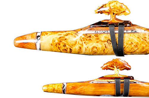 Celebrations are the first flutes Madison and Brent have designed and created together. The yellow wood is Yellow Cedar Burl and the red wood is Western Red Cedar Burl. The aromas of these woods are fabulous together. The flute also uses copper and engineered White Buffalo Turquoise. The totems are created with the new Tree of Life from the Woodsounds logo.